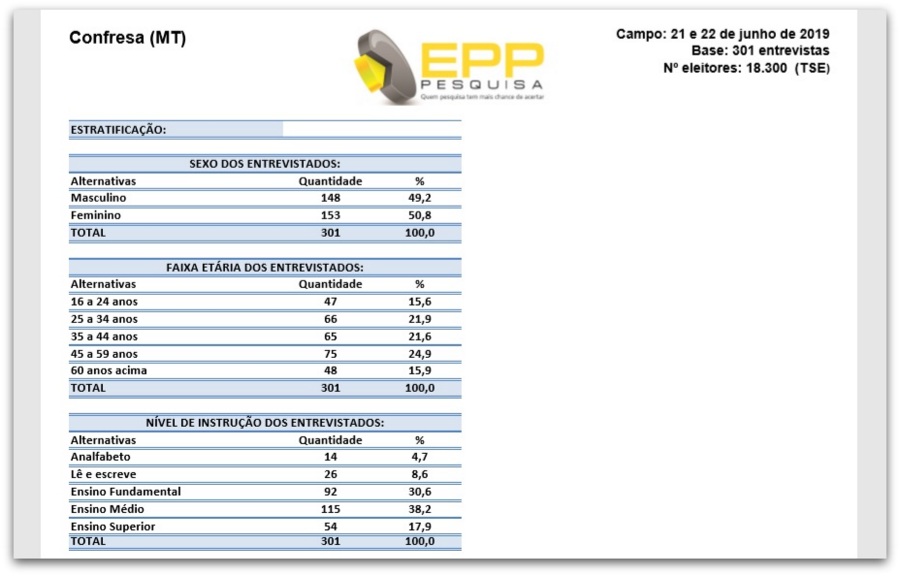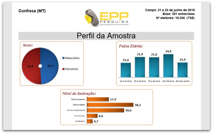 Os dados são frutos de uma pesquisa feita pela parceria do Jornal do Norte Araguaia ( www.nortearaguaia.com.br ) e o Instituto de Pesquisas EPP, durante o levantamento foram testados dois cenários, um espontâneo e outro estimulado. As amostras de campo foram feitas entre os dias 21 e 22 de junho de 2019, tendo como base 301 entrevistas de um total geral de 18.300 eleitores do município (TSE).