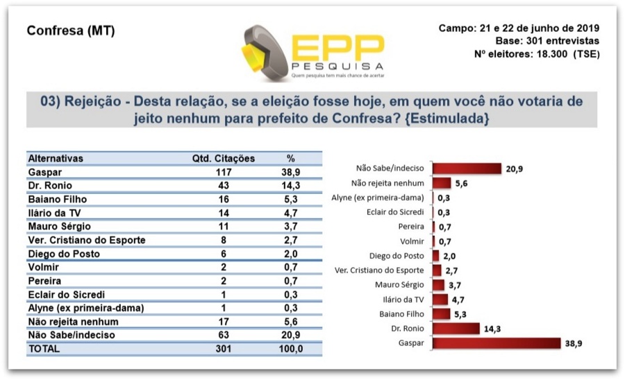 O levantamento fez a seguinte pergunta, Nos nomes desta relação, se a eleição fosse hoje, em quem você não votaria de jeito nenhum para prefeito de Confresa? Também mostra que 5,6 % não tem rejeição a nenhum dos nomes apresentados e que 20,9% não sabem em opinar ou estavam indecisos