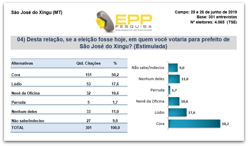 Durante o levantamento estimulado, foi realizada a seguinte pergunta; Nesta relação de nomes se a eleição fosse hoje, em quem você votaria para prefeito de São José do Xingu? No resultado final, a vereadora Cora obteve 50,2 % das intenções seguida pelo secretario Lúdio Barros com 17,6 %, o atual prefeito Nenê da Oficina só obteve 10,6 %, das intenções, e o ex-vereador Parruda obteve 1,7 de aceitação entre os entrevistados, 11% disseram que não votariam em nenhum deles, e 9% não souberam dizer em quem votar