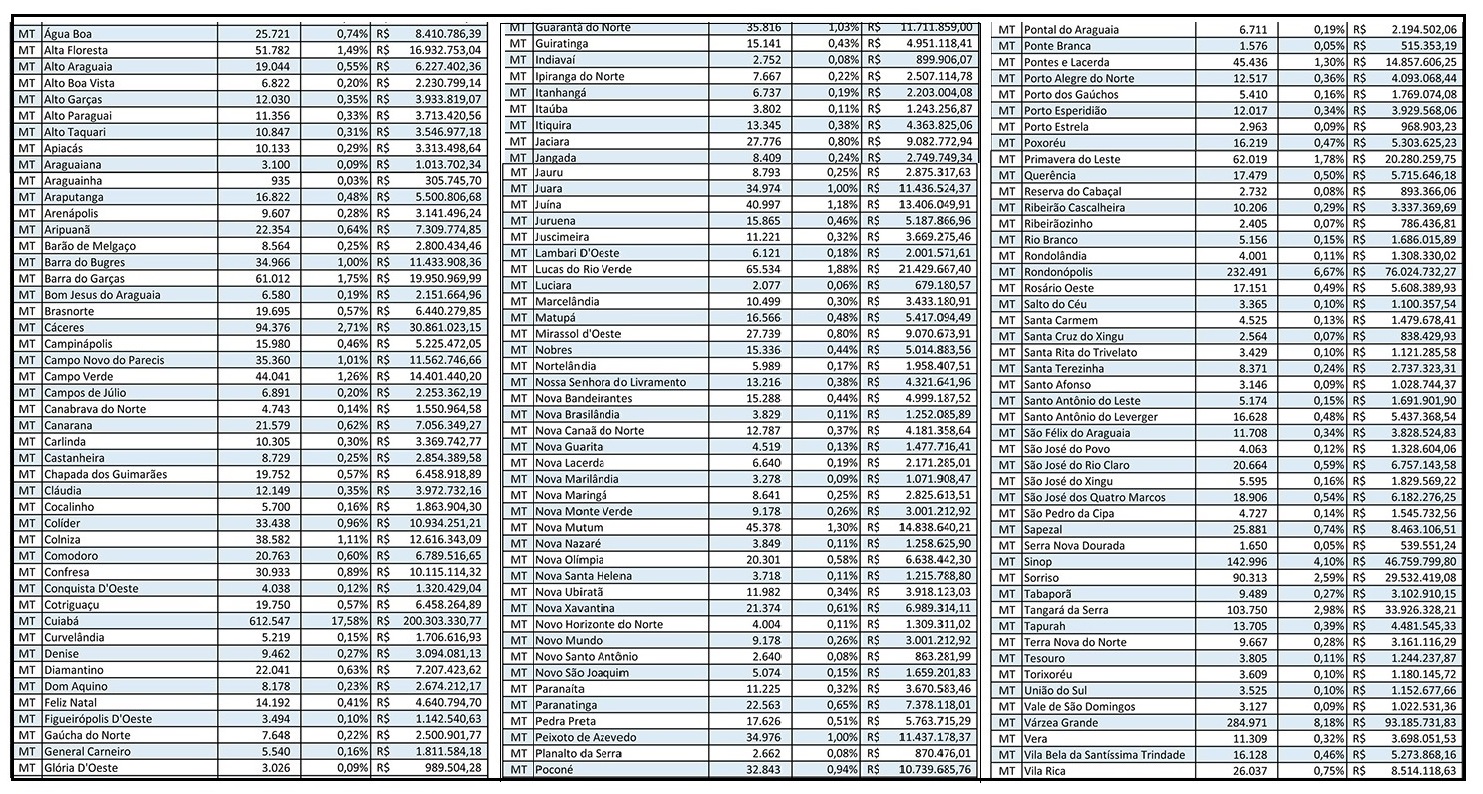 Os 141 municípios do Estado receberão juntos cerca de R$ 1,1 bilhão. Só a Capital de Mato Grosso receberá R$ 200,303 milhões. Várzea Grande, que é a segunda maior cidade em termos de população, receberá R$ 93,185 milhões.