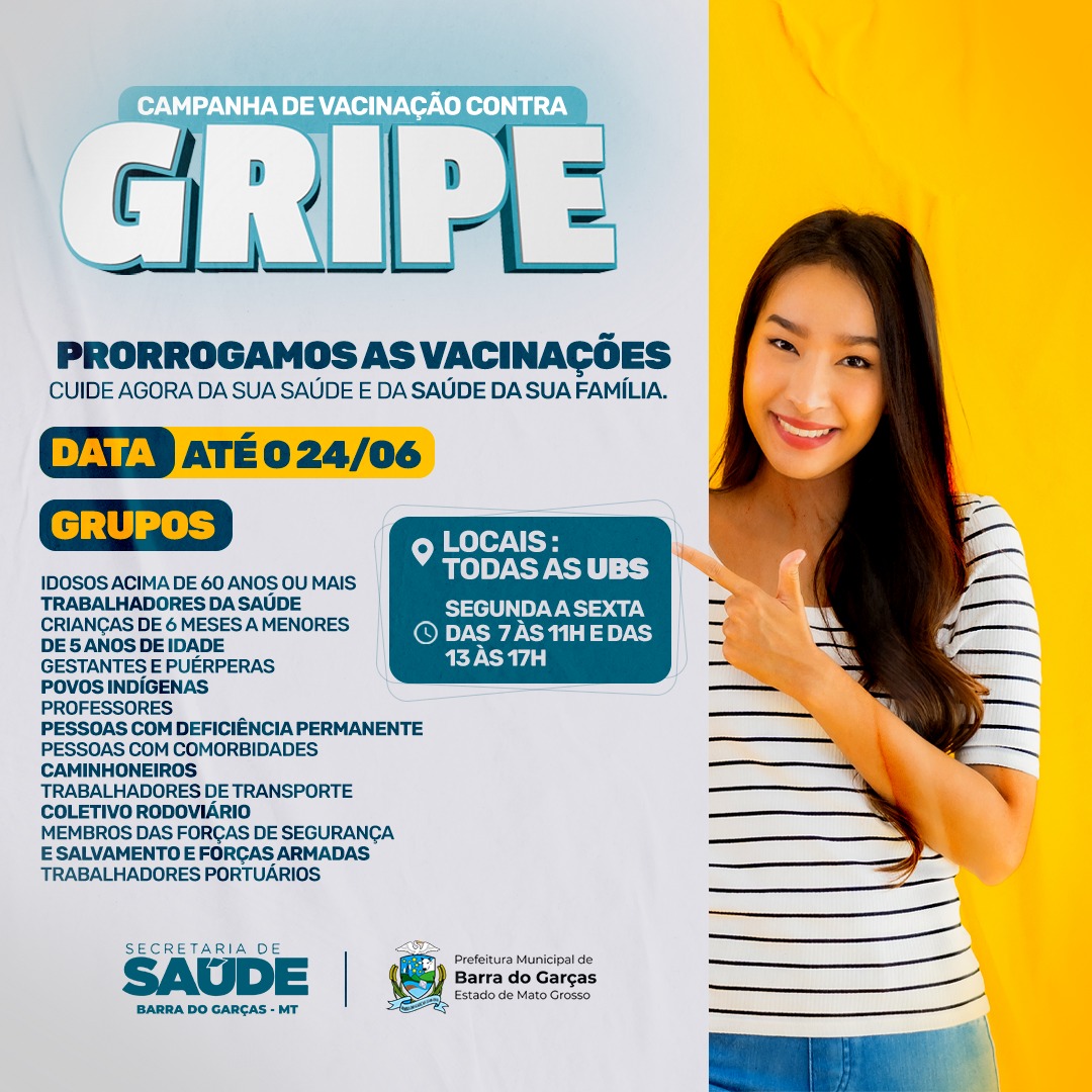 A Secretaria Municipal de Saúde divulgou nesta segunda-feira (06), o novo cronograma para a vacinação em Barra do Garças. Simultaneamente ocorrem no município as campanhas de vacinação contra Sarampo, Influenza e Covid-19.